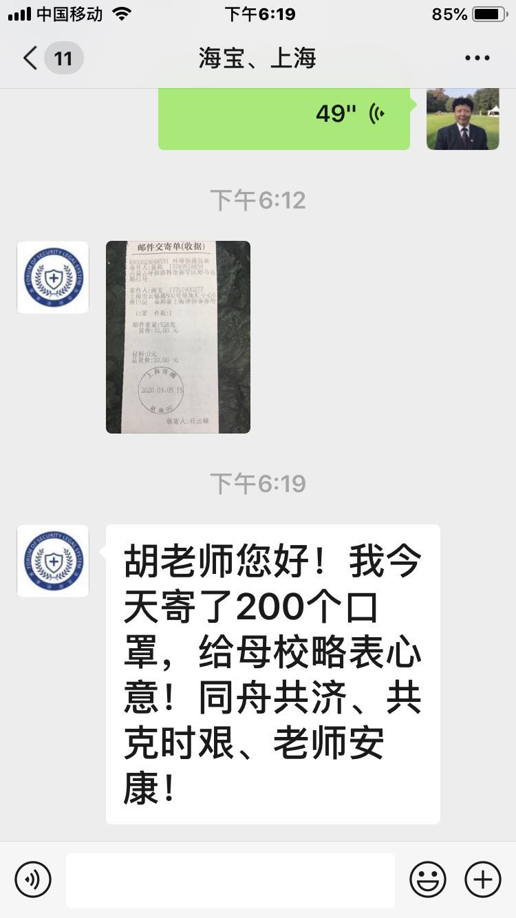2020年3月9日,承载者英国365上市官网1988届毕业校友海宝先生爱心的200个医用外科口罩的快递从上海来到了内蒙古师范大学。疫情发生后,海宝先生一直心系母校,四处奔走为母校采买防疫用品,在口罩极难买到的情况下,想方设法购买到200个医用外科口罩,2020年3月5日,海宝先生与学校校友会联系并寄出了自己的一片赤诚之心。在非常时期,海宝先生对学校的厚爱和深情,极大地激励了学校和学院的师生。学院为有海宝先生这样有担当的校友感到自豪。在此,对海宝先生表示衷心的感谢并致以崇高的敬意!