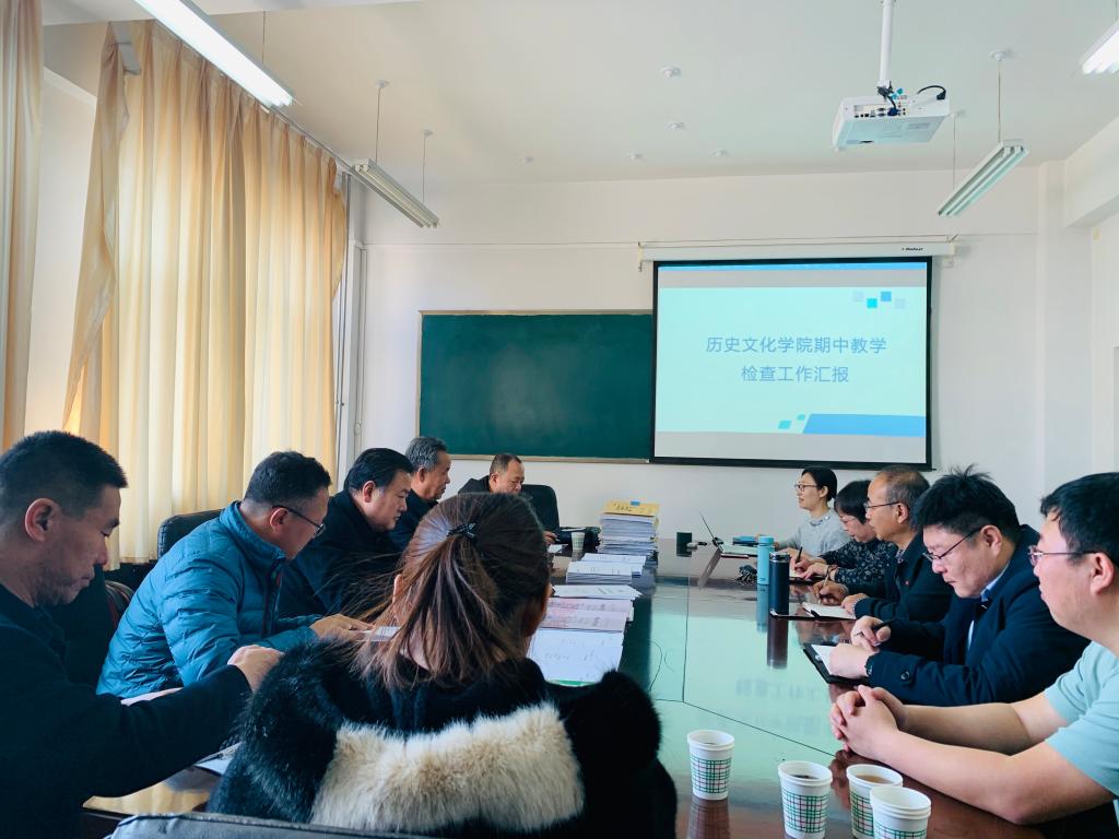 2020年11月19日上午,学校教务处督导组在盛乐校区学院楼英国365上市官网会议室对365官网进行期中教学检查工作。督导组由学校督导组成员汪子云教授、郝保文教授、田洋荣教授,化学与环境科学学院副院长包永胜,地理科学学院副院长萨楚拉,教育学院副院长边琦,教务处赵红叶等组成。英国365上市官网党委书记张升、副书记副院长李艳洁、副书记副院长宋磊、副院长袁丽丽、历史系主任白林等参加本次检查工作。
