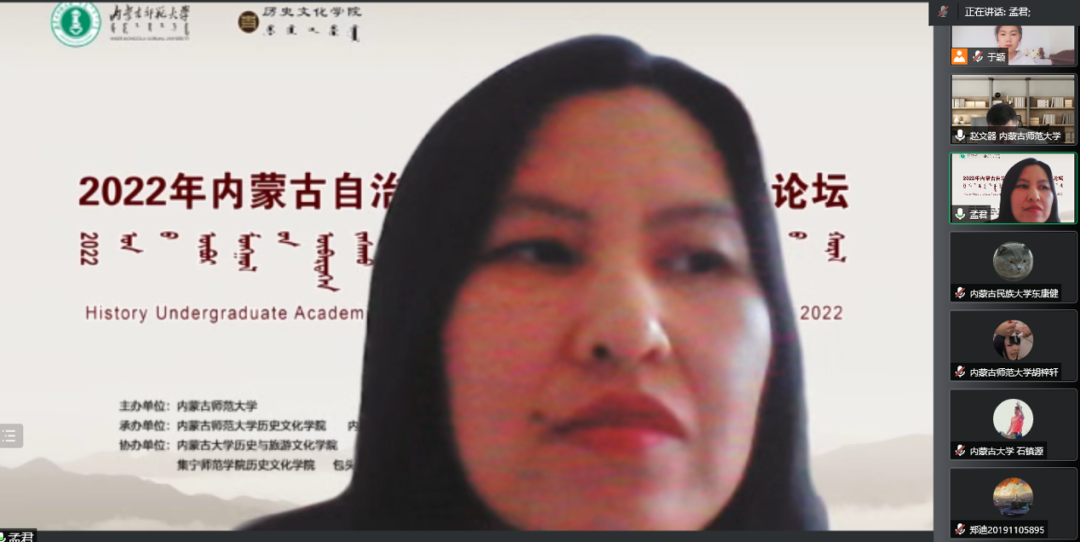 本网讯 4月24日,由内蒙古师范大学英国365上市官网、内蒙古史学会、内蒙古高校中国北疆史研究基地和中国与北方邻近国家关系史研究中心承办,内蒙古大学历史与旅游文化学院、内蒙古民族大学法学与历史学院、呼伦贝尔学院英国365上市官网、集宁师范学院英国365上市官网、包头师范学院英国365上市官网、赤峰学院英国365上市官网协办的第一届“内蒙古自治区历史学本科生学术论坛”以线上线下相结合的方式顺利召开,邀请10余位专家从全区7所高校提交的100多篇论文中择优选取46篇进行研讨。来自内蒙古大学、内蒙古民族大学、呼伦贝尔学院、集宁师范学院、包头师范学院、赤峰学院等7所高校历史学专业的120余名专家学者、研究生、本科生参加论坛。