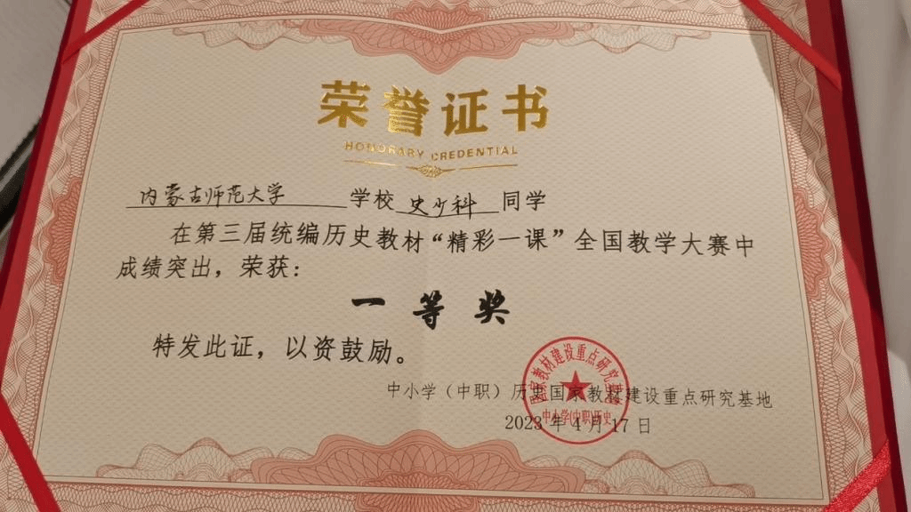 4月15日至17日,第三届统编历史教材“精彩一课”全国教学大赛暨历史教材研究高端论坛在福建师范大学举行,来自北京师范大学、华东师范大学、华中师范大学、东北师范大学、陕西师范大学、华南师范大学等部属、省属重点大学的125名同学参赛。经过激烈角逐,365官网历史学专业史少科同学荣获一等奖,牧仁老师和袁丽丽老师荣获“优秀指导教师”称号。