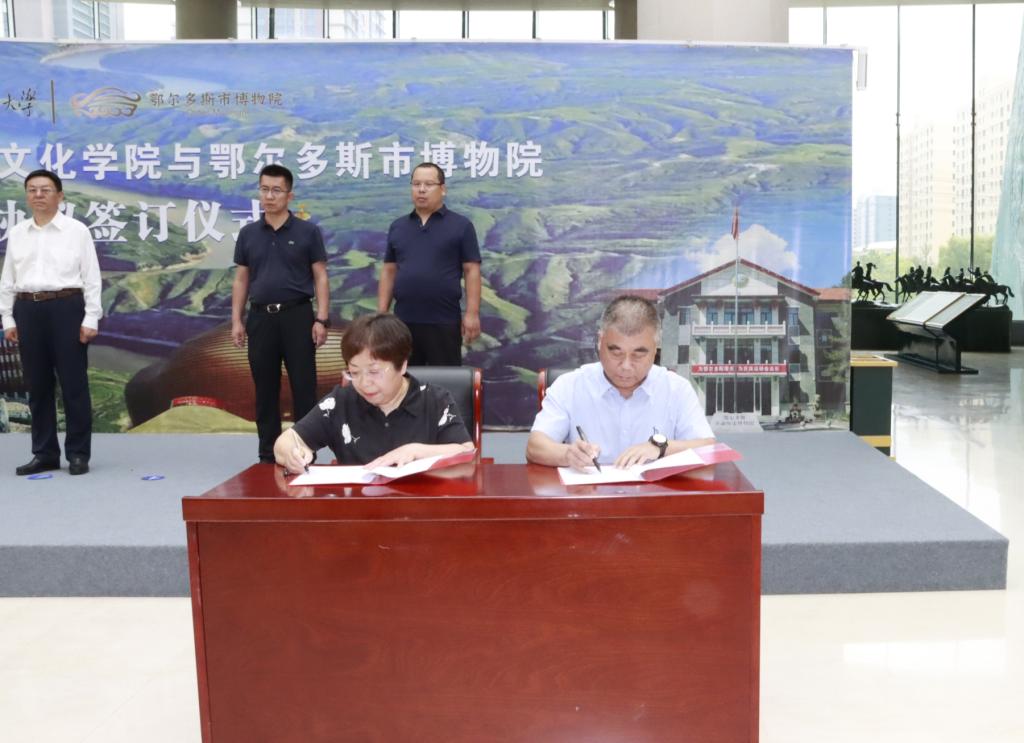 8月1日,英国365上市官网党委书记李艳洁,特聘教授、内蒙古博物院原院长陈永志,英国365上市官网副院长白林,考古文博系教师李鹏珍、袁刚、孟艳云,学院办公室主任永平等赴鄂尔多斯市与鄂尔多斯博物院签署了考古文博专业实践基地建设合作协议。