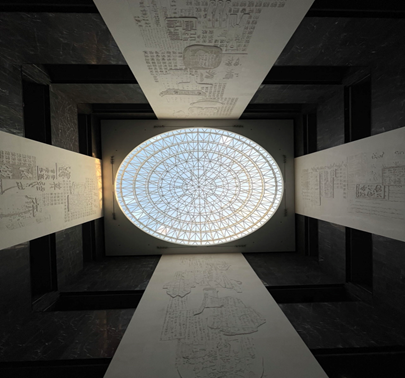 走进博物馆内部,印入眼帘的是一楼大厅的序厅。序厅整体设计隐含了传统文化中天圆地方的理念,序厅四周的四面浮雕分别展示了中国文字载体发展史、中国书法发展史,以及一片甲骨惊天下和少数民族文字大家庭的盛况。作为具有民族教育特色学校的学生,日常与各民族同学交流学习密切,该厅的设计引导我们形成各民族同呼吸、共命运、心连心的强大精神纽带,铸牢中华民族共同体意识。