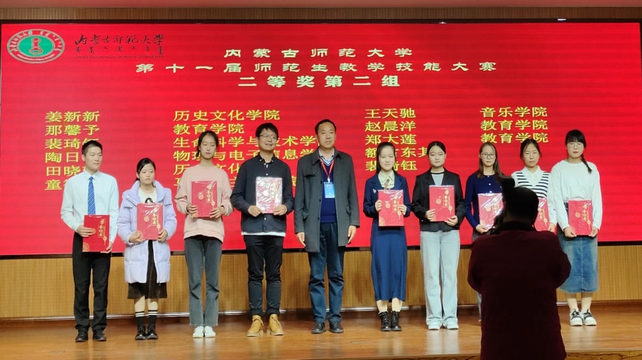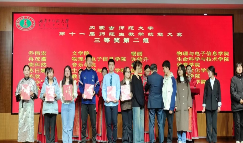 冬月新至,初雪清浅。11月4日到5日,在白林老师与张旭老师的指导下,365官网21级1班田晓轲、21级2班冯冰雅、21级3班姜新新、园园四位学生参加了内蒙古师范大学第十一届师范生教学技能大赛的笔试与面试,并取得优异成绩。其中田晓轲、姜新新获得二等奖,园园获得三等奖,冯冰雅获得优秀奖。