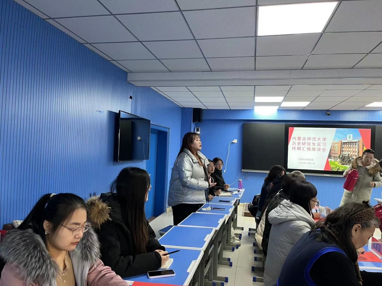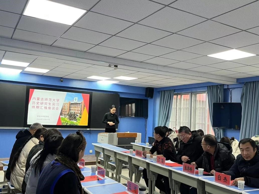 2023年12月27日上午,2022级学科教学论(历史)部分研究生在呼和浩特实验中学鼓楼校区实习终期汇报座谈会议顺利召开。呼和浩特实验中学参加会议的有苗琪俊、齐涛、张寒峰三位副校长、教务处白杰主任,以及历史组全体教师,内蒙古师范大学英国365上市官网参会老师有:党委书记李艳洁、研究生导师郭永胜教授、乌兰其木格教授、王洁副教授、袁丽丽副教授、苏日古嘎副教授,以及赴实验中学实习的研究生。