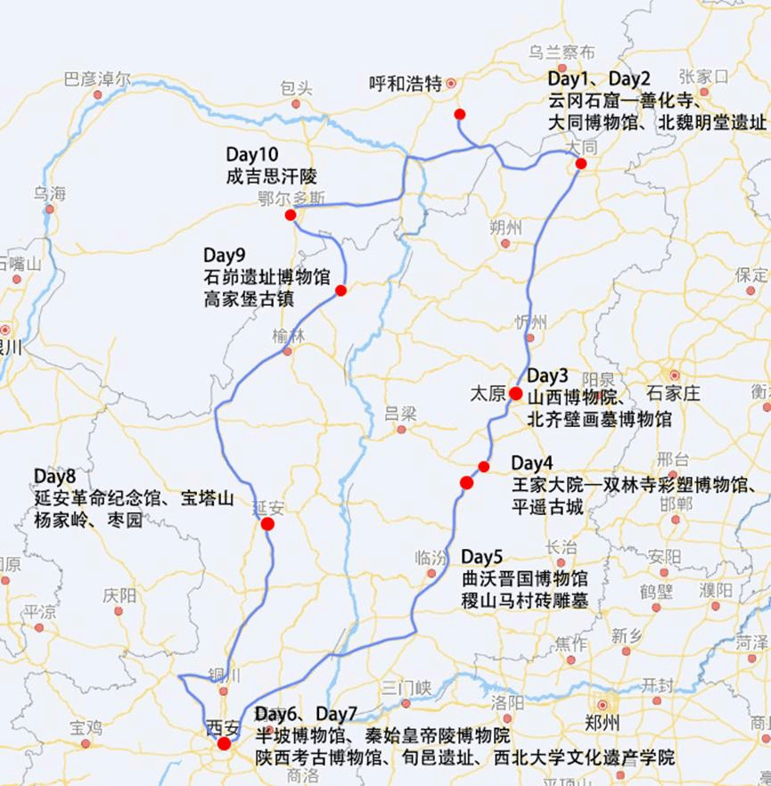 本次见习,横跨晋陕蒙地区的七座城市,沿线参观九大博物馆,深入探寻九大古迹遗址,站点包括云冈石窟、善化寺、大同博物馆、北魏明堂遗址、山西博物院、北齐壁画墓博物馆、王家大院、平遥古城、双林寺彩塑博物馆、半坡博物馆、秦始皇帝陵博物院、陕西考古博物馆、旬邑西周遗址、延安革命纪念馆、石峁遗址、高家堡古镇和成吉思汗陵等。
