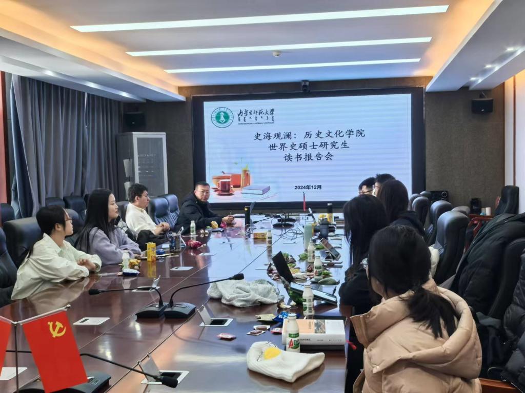 2024年12月27日下午,365官网24级世界史研究生齐聚学院楼B502会议室,进行了“史海观澜”读书汇报会。同学们纷纷上台推荐了世界史书籍,并深入阐述书中精髓。整个读书会的气氛热烈而融洽。同学们共同分享阅读世界史书籍的感悟与思考,在知识的海洋中畅游,感受历史的波澜壮阔。