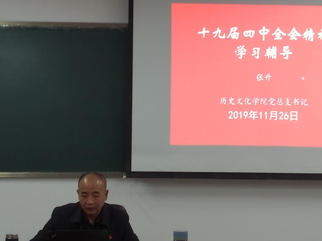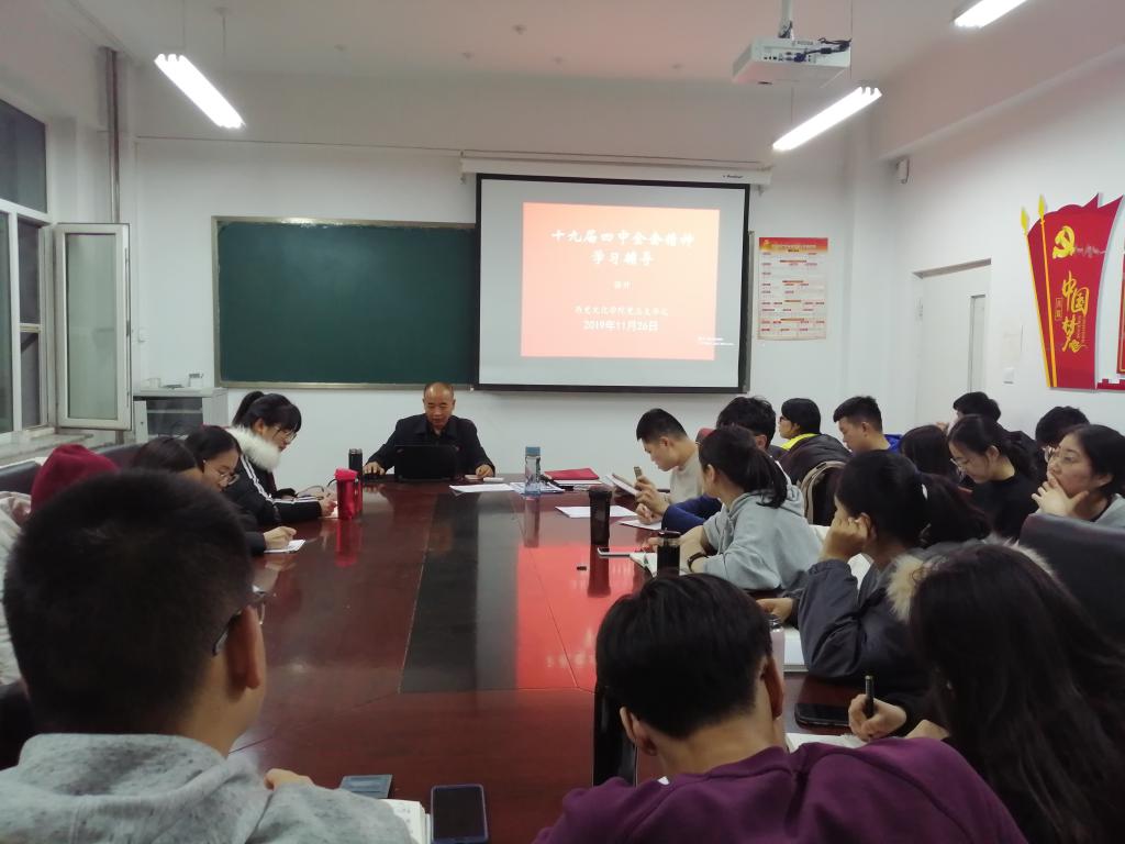 2019年11月26日晚7:30,英国365上市官网学生党支部组织专题党课,邀请学院党总支书记张升老师为大家做“党的十九届四中全会精神学习辅导”,学院学生党支部全体党员参加学习辅导,辅导中,张升书记就《中国共产党第十九届中央委员会第四次全体会议公报》、《中共中央关于坚持和完善中国特色社会主义制度 推进国家治理体系和治理能力现代化若干重大问题的决定》和习近平总书记所做的《关于〈中共中央关于坚持和完善中国特色社会主义制度 推进国家治理体系和治理能力现代化若干重大问题的决定〉的说明》三份文件的重要意义、内容和学习要点进行了详细讲解。