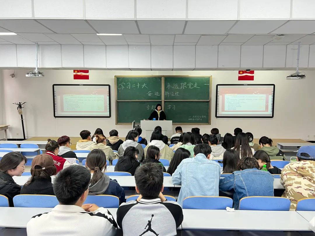 专题学习会上,领学的学生代表强调了要全面建设社会主义现代化国家、全面推进中华民族伟大复兴而团结奋斗的目标。随后,大家依次学习了“十年来的三件大事”、“六个必须坚持”、“中国共产党的中心任务”、“两步走战略安排”,以及讲述什么是中国式现代化、五个重大原则等关于二十大的重点论断。