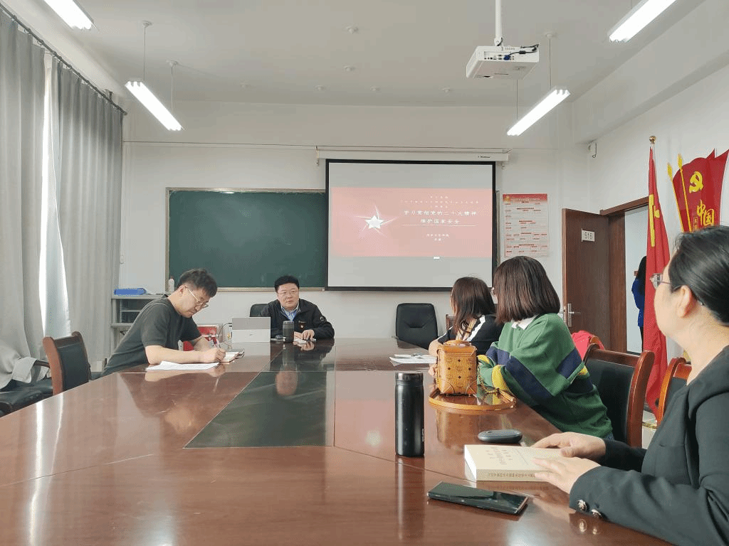 为深入学习贯彻习近平新时代中国特色社会主义思想,英国365上市官网文博行政教工党支部于2023年4月27日开展集体学习,由学院党委副书记宋磊为大家做《深入学习党的二十大精神,维护国家安全》为内容的专题领学。