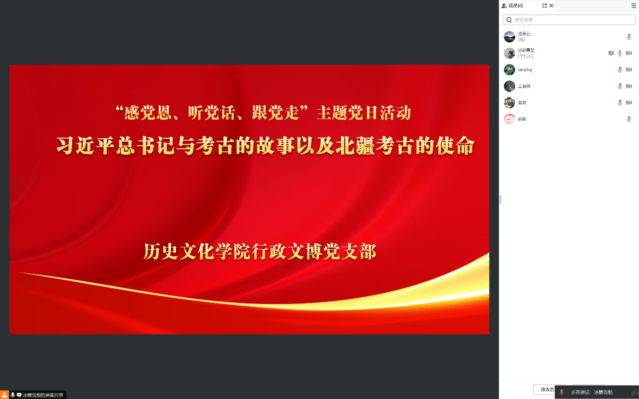 12月22日晚9点,行政文博党支部以腾讯会议的形式举办“感党恩、听党话、跟党走”主题党日活动——“习近平总书记与考古的故事以及北疆考古的使命”研讨交流会。本次活动由考古文博系主任、行政文博党支部书记李鹏珍主持,支部全体党员参会。
