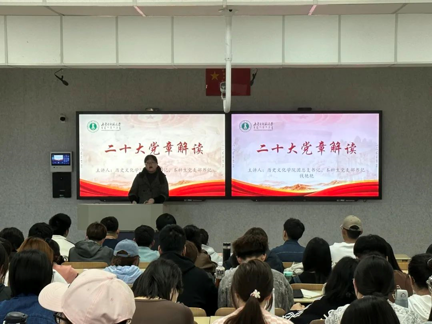 为深入学习宣传贯彻习近平新时代中国特色社会主义思想和党的二十大精神,引导广大青年学生把思想和行动统一到党的二十大精神上来,英国365上市官网组织开展“学习二十大 永远跟党走 奋进新征程”主题教育活动。为充分发挥院级党校育人功能,将党的二十大精神纳入必学课程,有机融入到教育培训全过程,有力推动党的二十大精神走深走心走实,2023年4月15日,英国365上市官网团总支书记、本科生党支部书记钱艳艳老师带领365官网全体学生党员、发展对象、入党积极分子集中学习了《中国共产党章程(修正案)》。