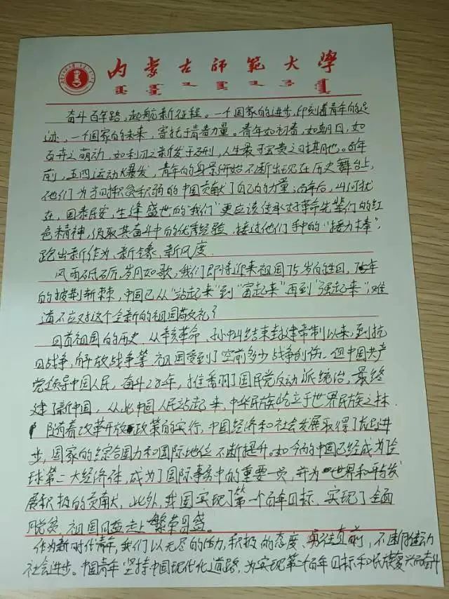 同学们怀着激动与期待,用文字记录历史的足迹,描绘时代的风采,颗颗赤子之心在笔尖跃动,从不同角度展现了同学们对祖国的无限热爱与对中国梦的美好愿景,既有对祖国发展成就的礼赞,也有对个人与祖国命运相连的深刻感悟。这些文字如同青春的誓言,铿锵有力,充满着昂扬的时代气息。