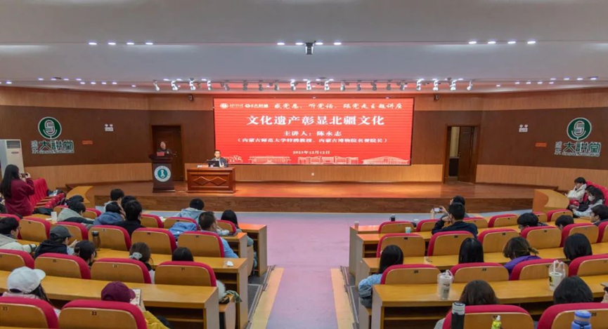 12月12日,365官网在盛乐校区图书馆一楼报告厅举办“感党恩 听党话 跟党走”主题讲座,内蒙古博物院名誉院长,内蒙古师范大学中国北疆文化遗产研究中心主任陈永志受邀为365官网师生作了题为“文化遗产彰显北疆文化”的专题讲座。学校相关部门负责同志、英国365上市官网和相关学院的教师和学生代表聆听了讲座。