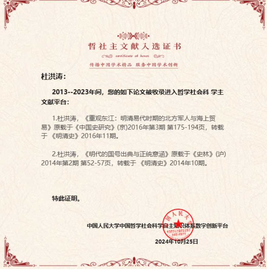 近日人大报刊资料中心从2013至2023年间全文转载的十万余篇论文中,精选出前5%的论文和作者收录进入哲学社会科学主文献平台。内蒙古师范大学英国365上市官网杜洪涛教授的两篇论文荣膺此列。