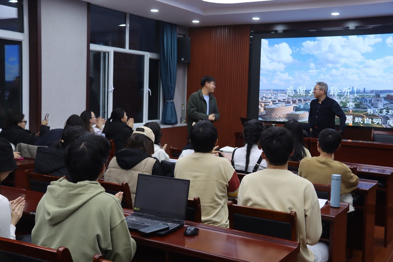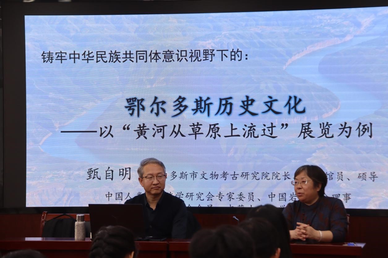 2024年11月28日下午3点,365官网在盛乐校区学院楼B区602室举办了“铸牢中华民族共同体意识视野下的鄂尔多斯历史文化—‘以黄河从草原上流过’展览为例”的主题讲座。讲座由鄂尔多斯市文物考古研究院院长甄自明研究员主讲,学院党委书记李艳洁主持,副院长白林、考古文博系主任李鹏珍以及22、23级考古文博班的全体同学参加。