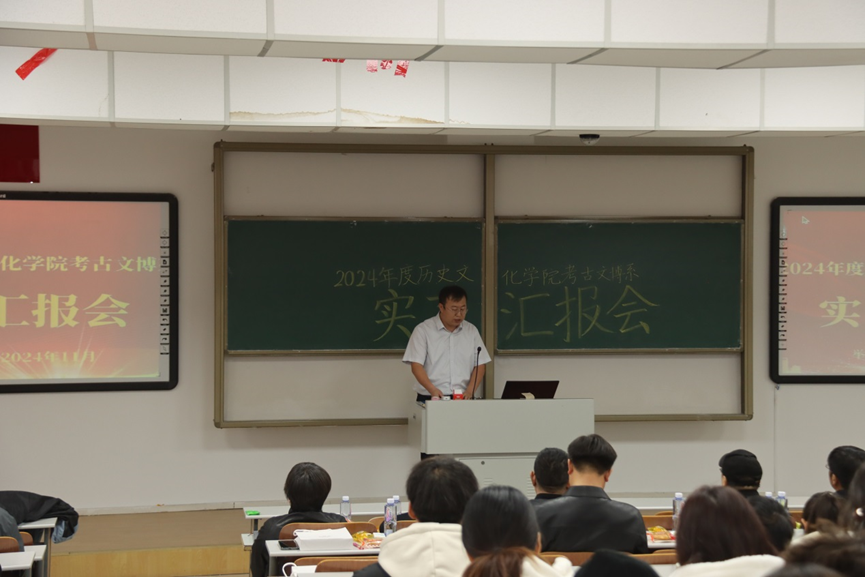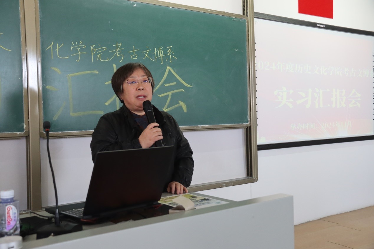 最后由学院书记李艳洁进行汇报总结。她指出,同学们以饱满的热情和专业的态度,向与会人员展示了他们在实习期间的收获。同学们通过精美的PPT、生动的讲解以及心得分享,详细介绍了田野发掘、四普调查、文物整理流程与绘图经验、博物馆日常工作流程等方面的内容。从汇报中,我们可以看到同学们对考古文博工作的认真态度和对文化传承的热爱,希望同学们能够珍惜这次实习经历,将在专业实习中学到的知识和经验运用到未来的学习和工作中,继续发扬实习期间所展现出的优秀品质和精神风貌,为考古文博事业贡献更多的力量。